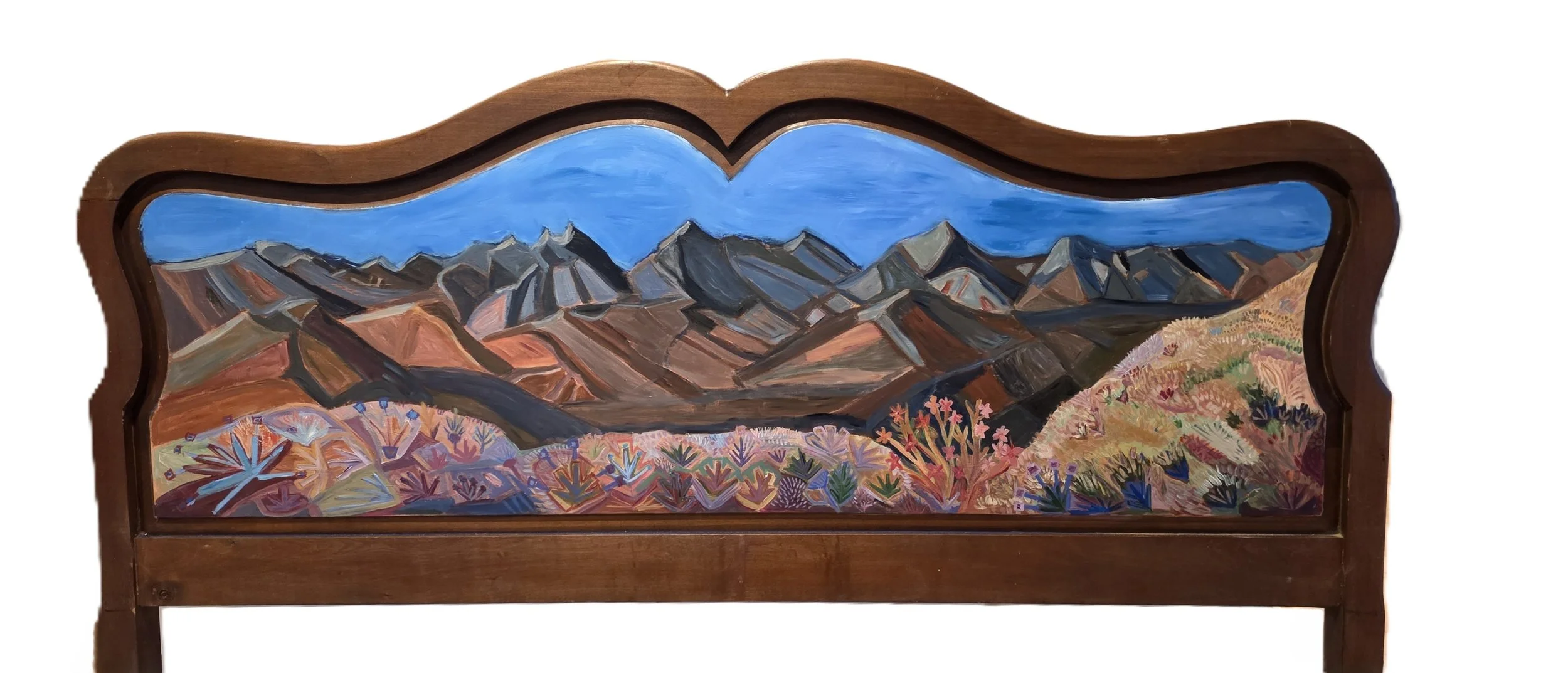 Re:Framed: Re:Homed brings together a series of paintings created on recycled wood, each chosen for its prior life and material character. Old mirrors with the glass removed, sections of cabinetry, and reclaimed furniture form the surfaces for these works, giving every piece a distinct, built-in frame marked by scratches, dents, and traces of use.